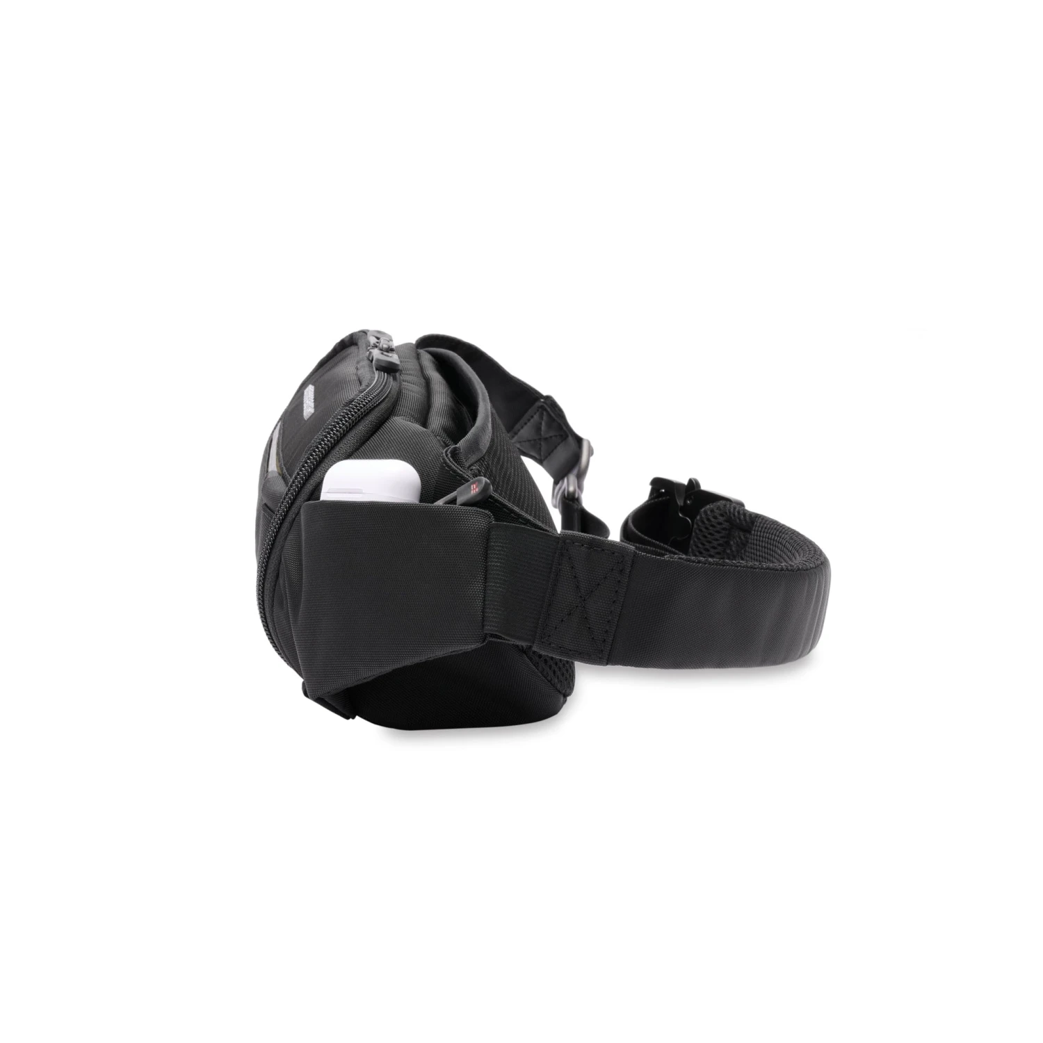 - Discreet side pocket designed to hold wireless earbuds or other small necessities