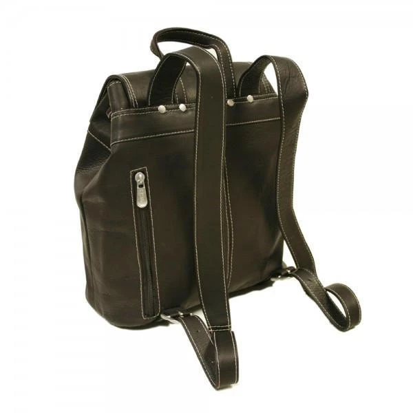 Flap-over with magnetic snap closure opens to front zip-pocket and main compartment with drawstring closure. Interior zip-pocket, full organizer, rear zip-pocket, top handle, and adjustable 29″ backpack straps.