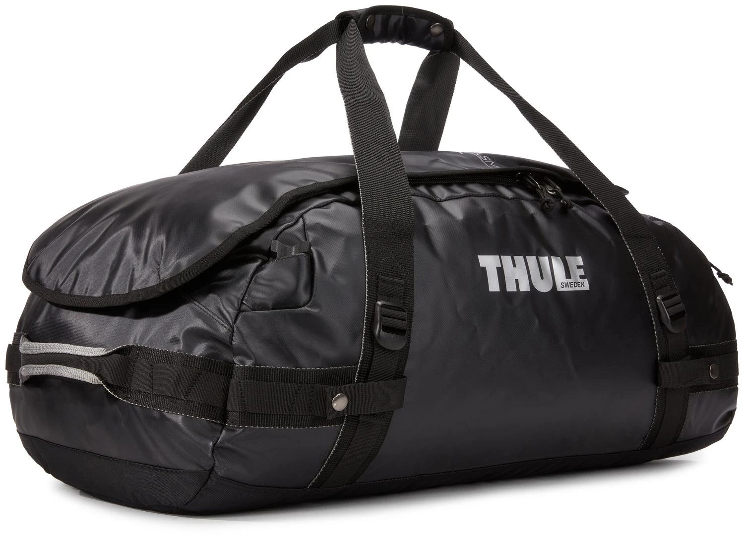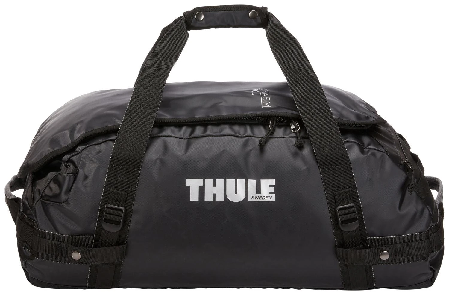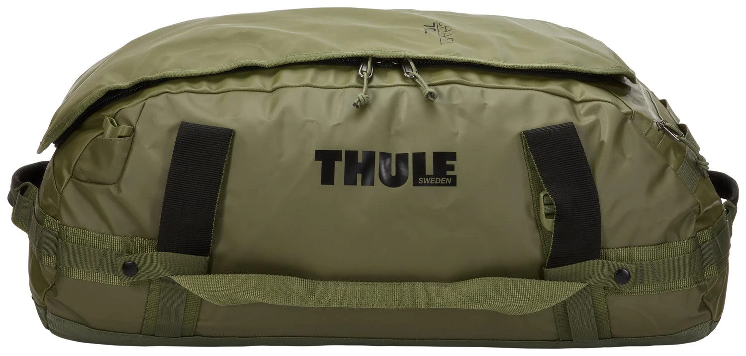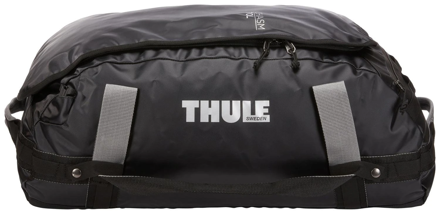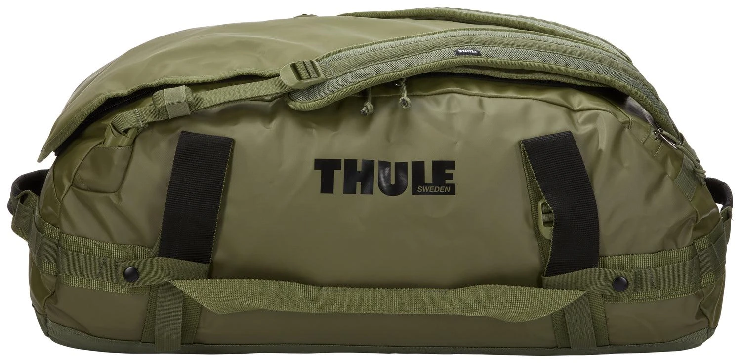 Thule Chasm 70L duffel bag is a rugged, weather-resistant bag that can be converted into a backpack with removable shoulder straps.