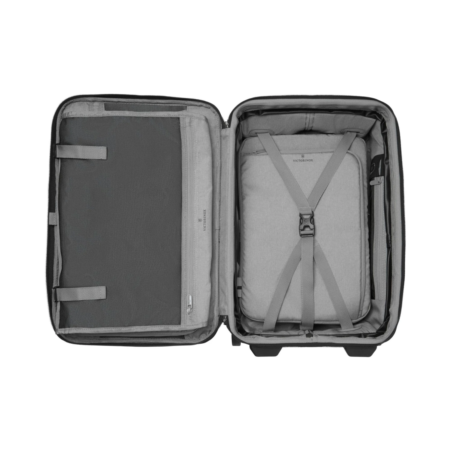 - Wheel hubcaps are color matching to the color of the bag and show the Victorinox Cross & Shield logo